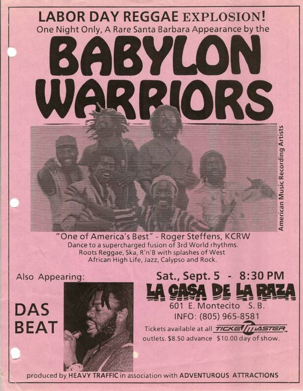 The Warriors, an L.A. based reggae group, have been seen and heard in Santa Barbara twice before and both concerts were sellouts. Their recording of “ONE LOVE” and “RIGHT NOW” are currently getting lots of radio airtime, both here, (KTYD will play it if you request it and KCSB has a live recording from the earlier shows) and in L.A. or Babylon, as some call it.