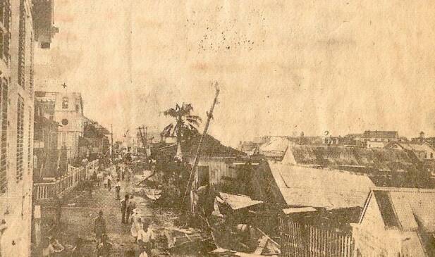 It did come. The storm, which lasted about an hour and a half, left some houses roofless and blew down some fences and trees. St. John's College was situated by the seaside up at Loyola Park over Yarborough Bridge. The building was a large, three storey, wooden structure, and went down in the first storm, as also did St. Andrew's Hall, which was situated corner of Prince and Albert Streets.